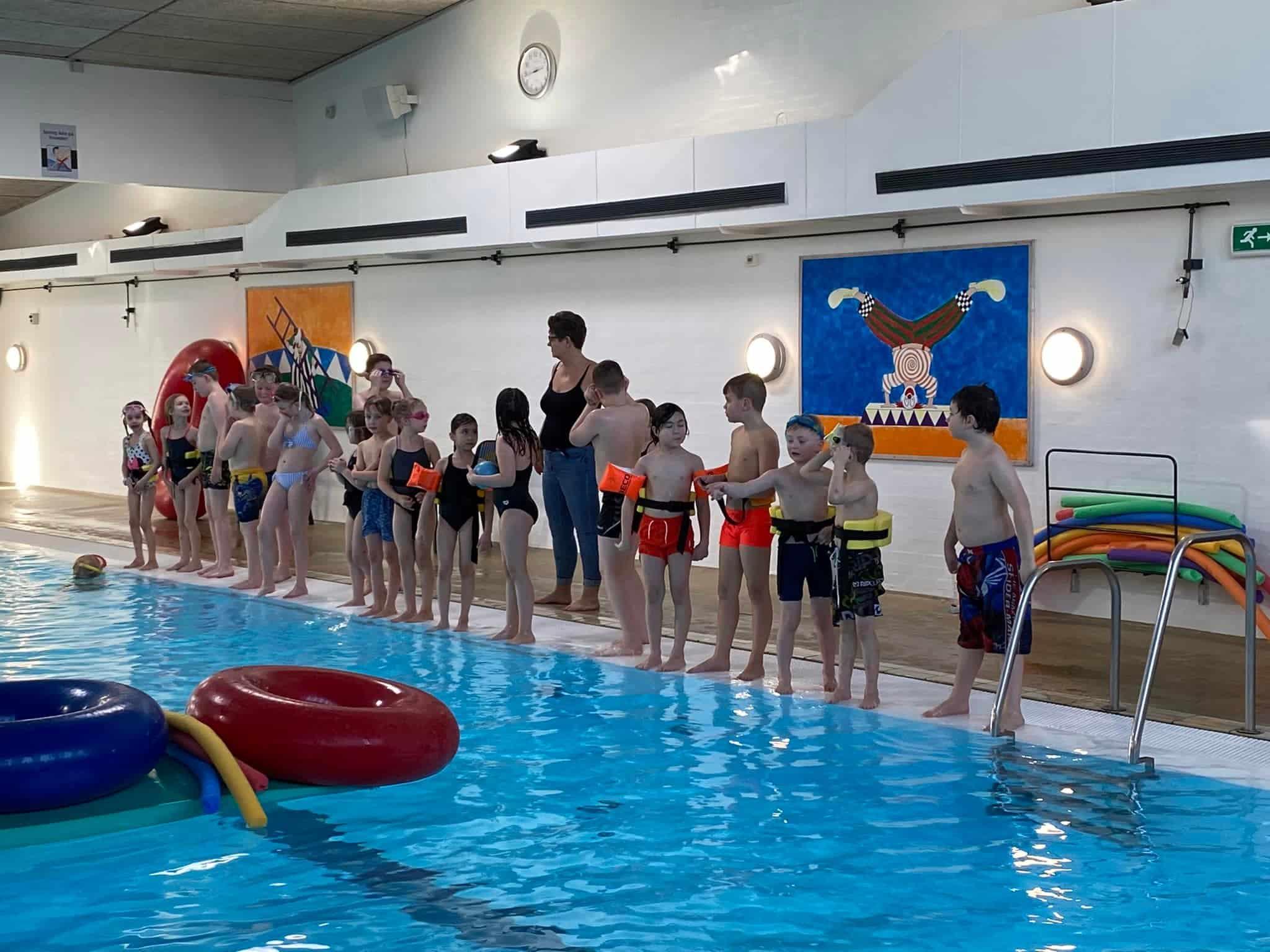 Hvis man ikke kan komme med i vandet. Skal man side på kanten. Alle er i Svømmehallen.